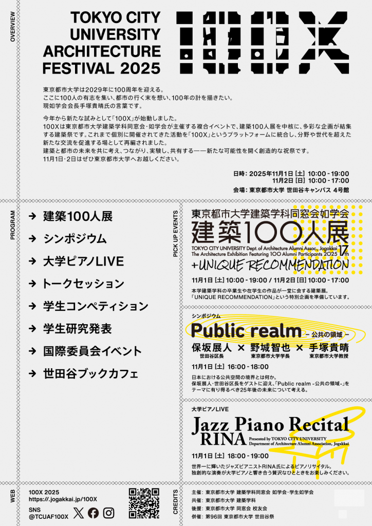 100Xは建築学科同窓会・如学会が主催する複合イベントで、建築100人展を中核に、多彩な企画が結集する建築祭です。これまで個別に開催されてきた活動を「100X」というプラットフォームに統合し、分野や世代を超えた新たな交流を促進する場として再編されました。